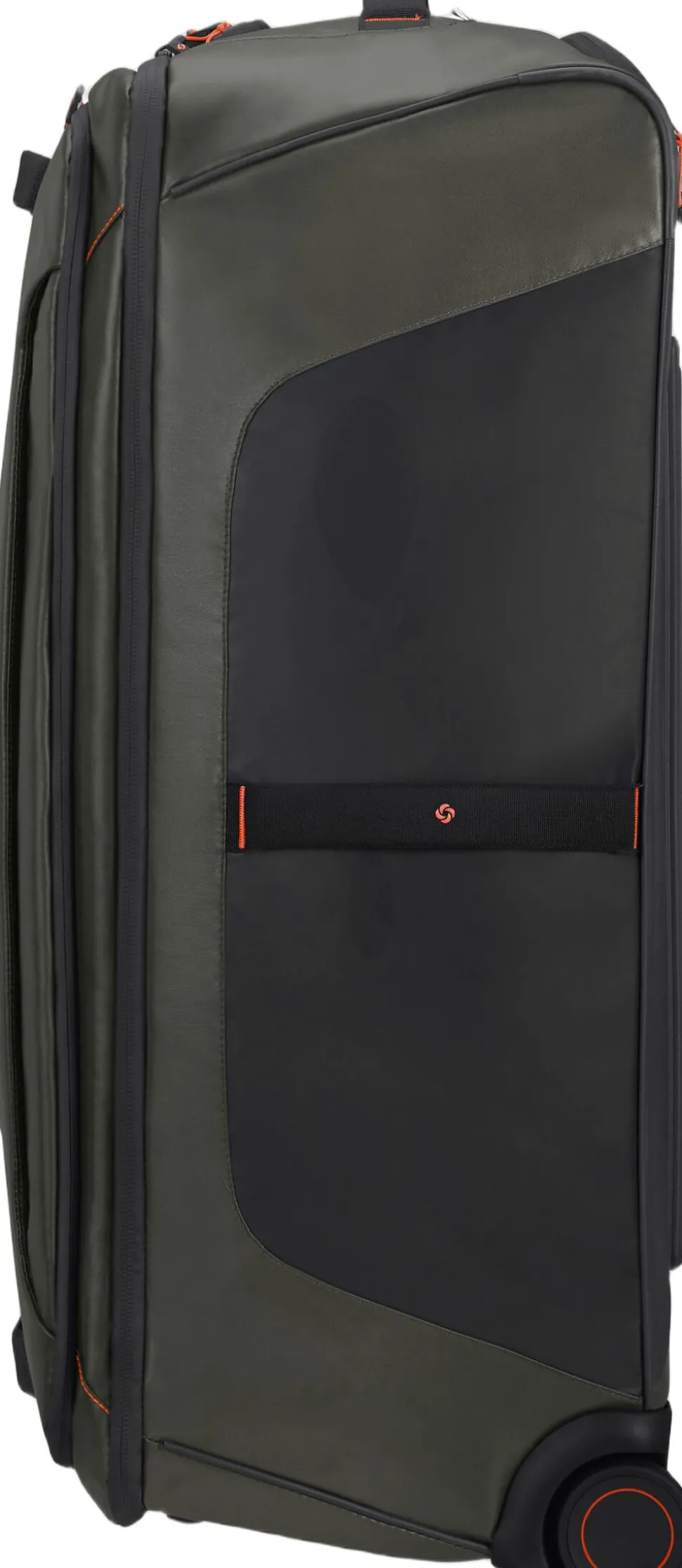 Duffle på hjul hvor både det udvendige og indvendige stof er lavet af genbrugt nylon og polyester, vandafvisende materiale, front og sidelomme, TSA lås, rumindhold 122 liter, vægt 3,4 kg. 5 års begrænset garanti.