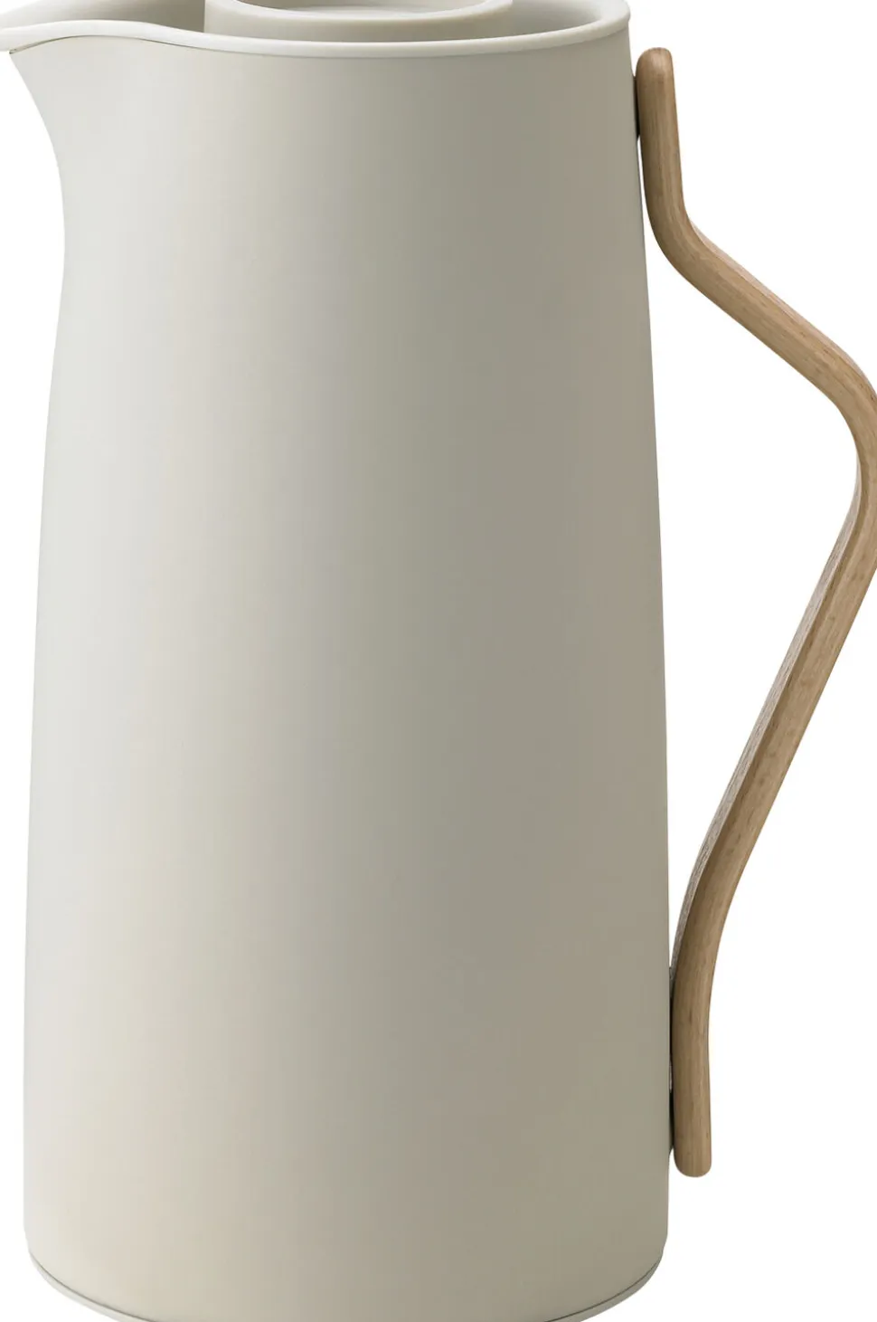 Emma kaffe-termokanden indbyder til brygning af traditionel filterkaffe. Kanden er designet af HolmbäckNordentoft i et moderne, skandinavisk design, der kombinerer lakeret stål i sandfarve med en hank i bøgetræ. Den isolerende stålindsats sørger for at kaffen holder sig varm længe og termokanden indeholder 1,2 l. Med et enkelt klik på låget er kanden åben, hvilket gør at kanden er let at betjene med én hånd. Kaffe-termokanden er både traditionel og innovativ på én gang, og den stoflige sandfarve giver kanden et keramisk udtryk.
