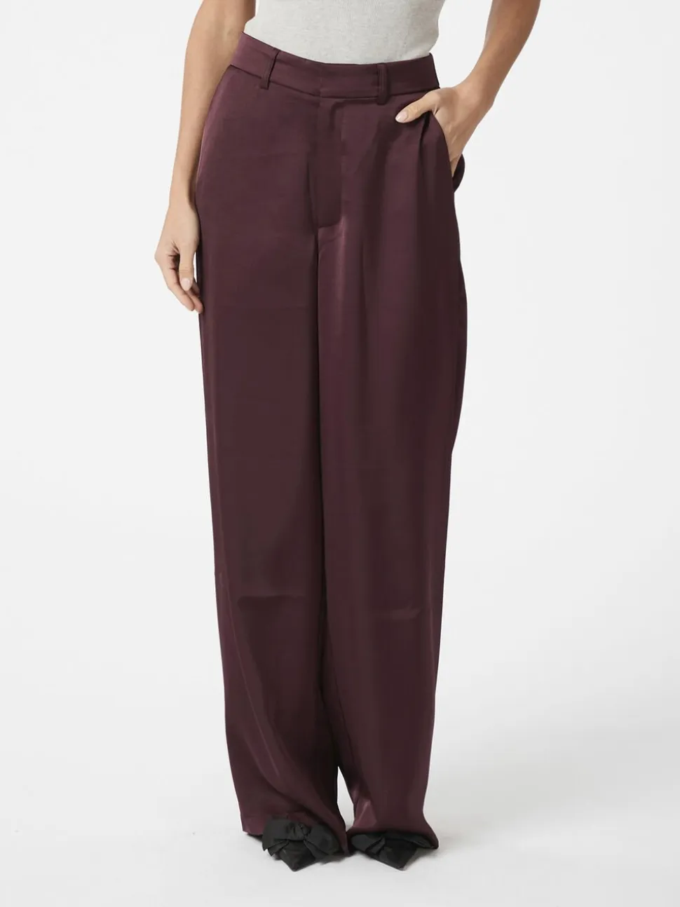 Bukser i en kraftig satin. Bukserne er højtaljede og har lige ben med vidde. De lukkes med skjult lynlås og hægte, har bæltestropper i taljen og lommer i siden. Modellen er iført størrelse 36.