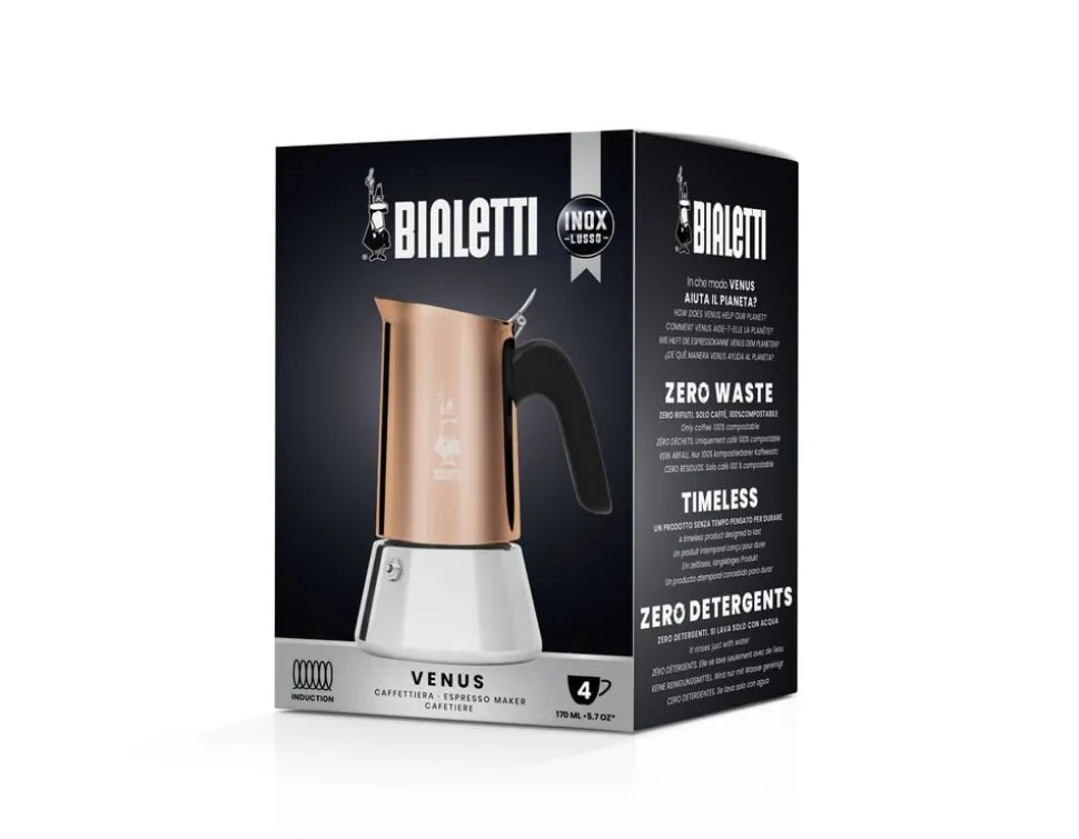 Bialetti Venus er en italiensk espressomaskine lavet af rustfrit stål med kopper finish udvendigt på kanden. Venus kan bruges induktionskogeplader samt gas-el komfurer. 4 espressokopper a 170 ml. Varmeafvisende plastikhåndtag, hvis ergonimiske form sikrer en behagelig hældning af den frisklavede kaffe. Venus elegante stilrene design er en flot tilføjese til dit køkken, og gør det nemt at lave ægte italiensk kaffe derhjemme. Rengør miljøvenligt uden rengøringsmidler og kanden tåler ikke opvaskemaskine.