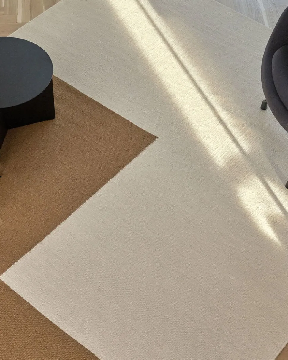 Gulvtæppet har et minimalistisk udtryk med sine neutrale farver og vil passe ind i enhver indretning.