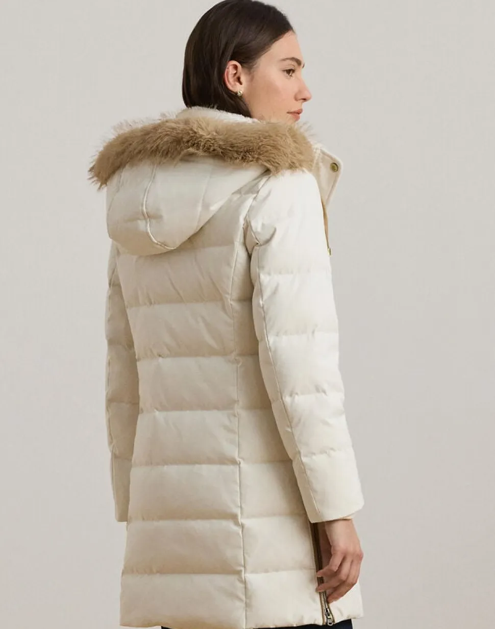Denne kanalquiltede frakke er lige dele stilfuld og praktisk og designet med en aftagelig hætte med imiteret pelspyd, en vandafvisende skal og behagelig 450-fyld-strøm for at holde dig tør og varm. Prinsessesøm foran og bagpå fremhæver denne stils strømlinede silhuet, mens “LRL”-indgraverede metalknapper tilføjer signaturstil