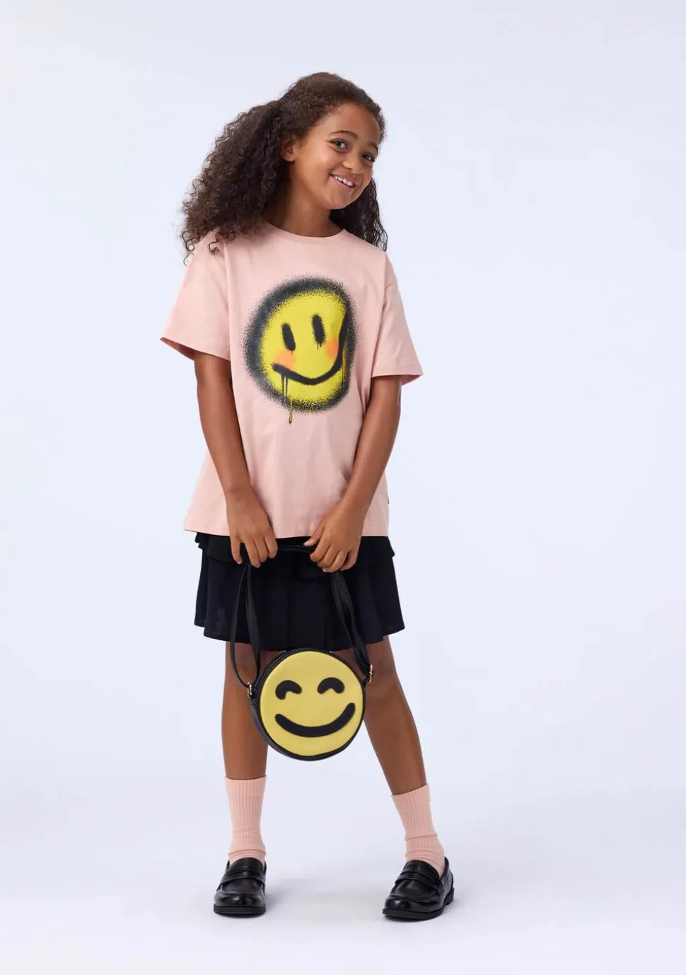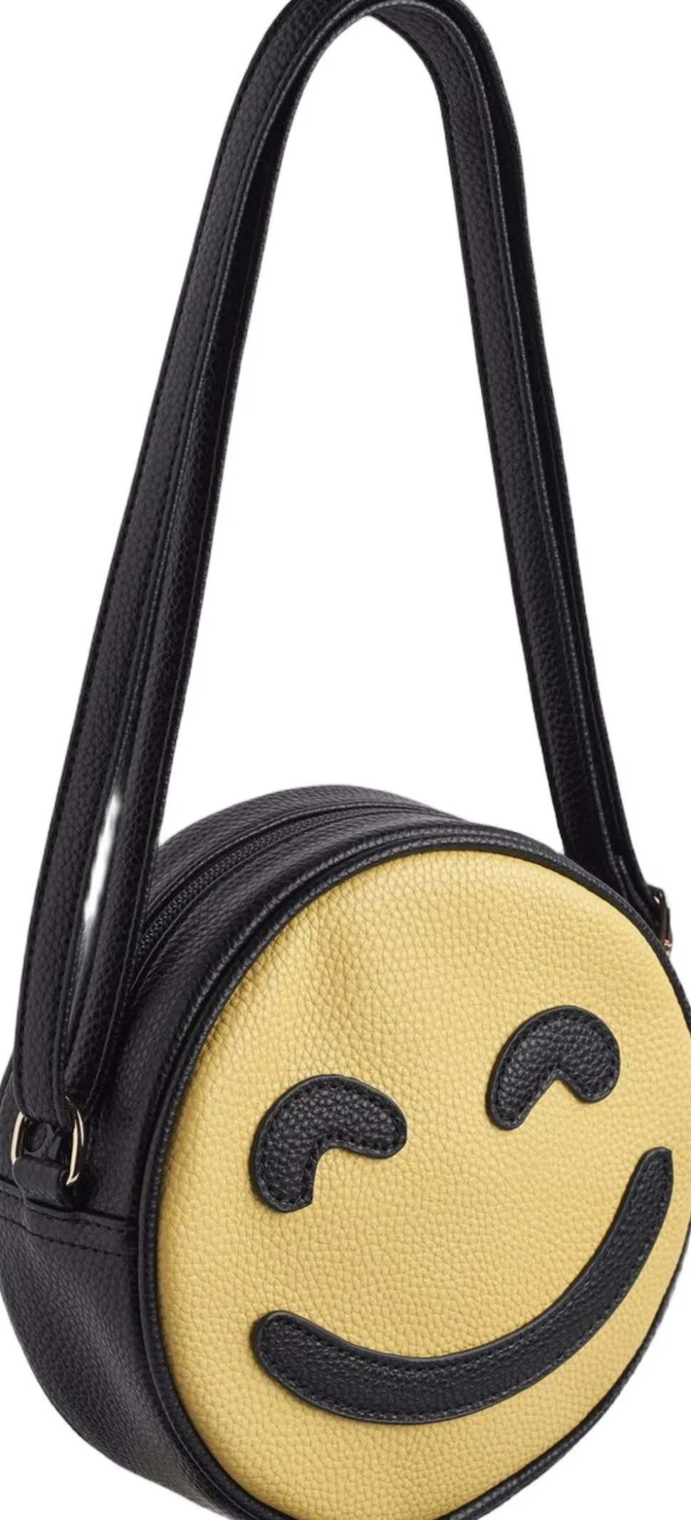 Rund taske fra Molo med gult smilende ansigt og lilla surt ansigt. Tasken har en justerbar strop og et lille indvendigt rum med lynlås. Tasken måler 17 cm i både højden og bredden og 5 cm i dybden.