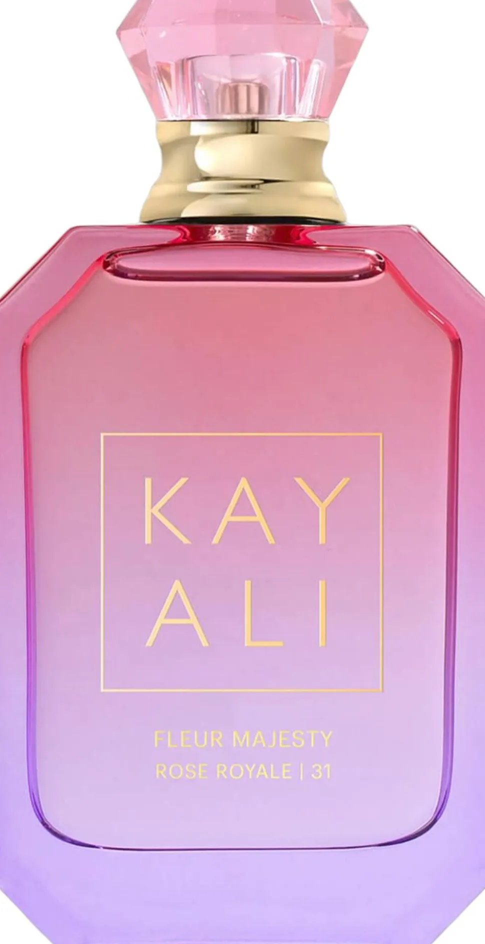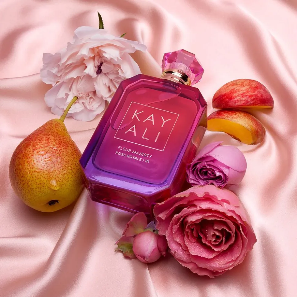 Fleur Majesty Rose Royale | 31 fra KAYALI afslører en blændende ny glasflaske med en flot graduering, der går fra blændende pink til kongelig violet helt enestående. De diamantformede flasker og overdådige cabochoner, der er symbolske for KAYALI, er inspireret af de traditionelle oud-flasker fra Mellemøsten. Tallet angiver, hvor mange formuleringer der skal til for at skabe den perfekte duft.
