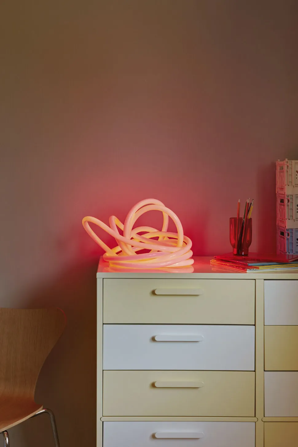 Skab kunstneriske former og udtryk med FLEX-lampen fra Studio About. Med lampens lange og bev¾gelige design kan du forme, b¿je og manipulere lampen, som du ¿nsker, og tilf¿je bev¾gelse og en smuk, farvet gl¿d til dit hjem. Den r¿de farve giver et moderne, farverigt og varm lys, og g¿r lampen til et kunstnerisk og ¾stetisk blikfang. Denne LED-lampe er 5 meter lang i farven r¿d og er designet af arkitekt Mikkel Lang Mikkelsen.EN R¯DLIG GL¯DDen r¿de neonfarve skaber et f¾ngslende blikfang og giver en flot og farvet gl¿d, der skaber varme og intimitet i rummet. Det er en unik mde at f farve ind i hjemmet og er et frisk alternativ til det traditionelle hvide lys.FLEX-lampen er en nyt¾nkende og moderne lyskilde, der giver et organisk udtryk med dens bl¿de og fleksible kurver. Den skaber varme, liv og hygge og er den perfekte belysning til en moderne, eksperimenterede og ¾stetisk livsstil.SANSELIG OG BEV®GELIG LAMPELampen har et minimalistisk design, men transformeres med sin b¿jelige form til en innovativ designerlampe og unikt kunstv¾rk. Den inviterer netop til kunstnerisk udfoldelse og til at eksperimentere og lege med dens bev¾gelighed. Mulighederne er mange, da den bde kan bruges som v¾glampe, bordlampe eller loftlampe. Du kan skabe et personligt og unikt m¿nster p v¾ggen med de medf¿lgende oph¾ng