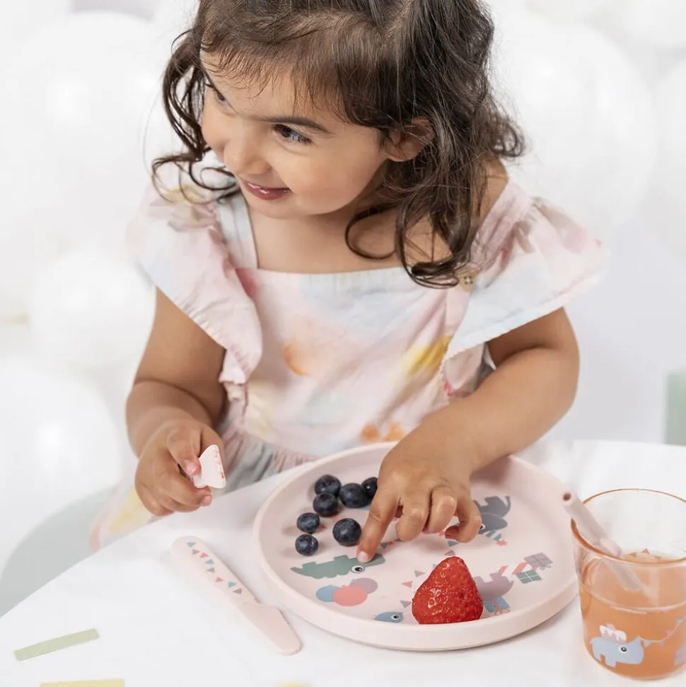 - Materiale:Tallerken: 100% fødevarekvalitet PP med antislip TPE. Bestik: 100% fød