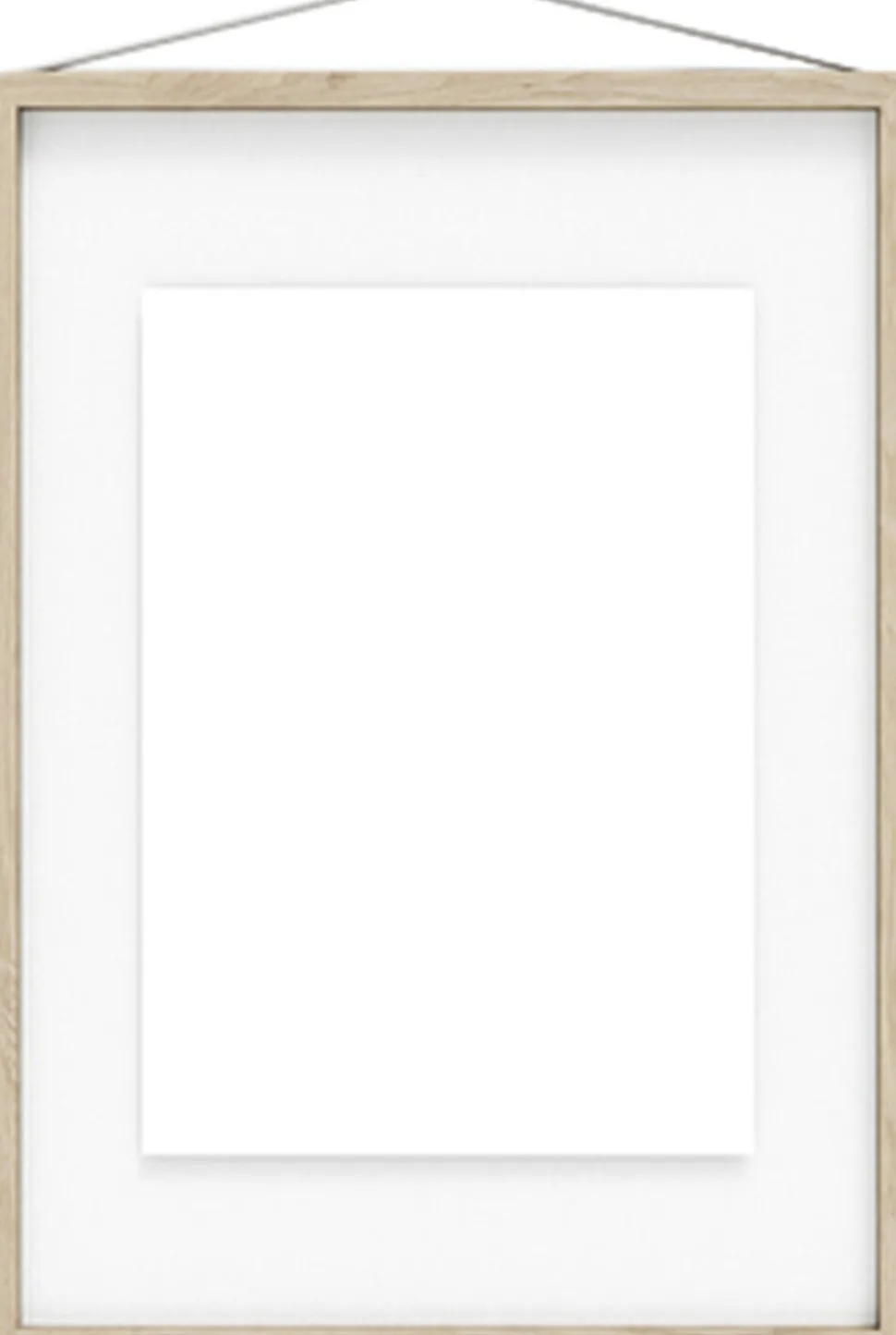 Frame consists of two pieces of acrylic glass, four lists made of either ash or aluminium and a rubber band.