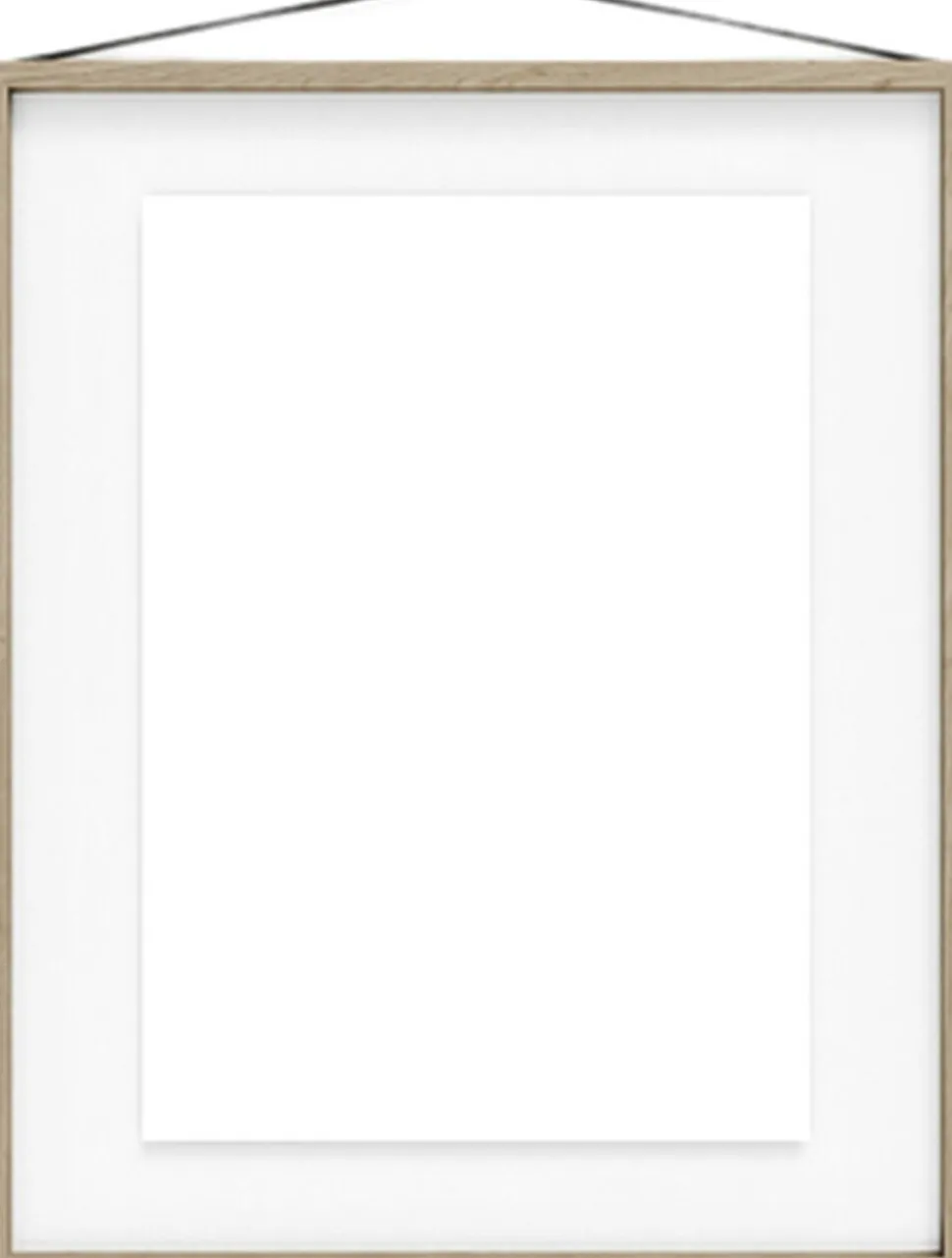 Frame consists of two pieces of acrylic glass, four lists, and a rubber band. The rubber band both holds the frame together and serves for hanging the frame on your wall. The simple but clever construction allows the frame to be hung in either direction or even to be viewed from both sides, giving your artworks or photographs the focus they deserve. Choose from ten different finishes and six different sizes (40×50 cm & 50×70 cm available only in oak & black).