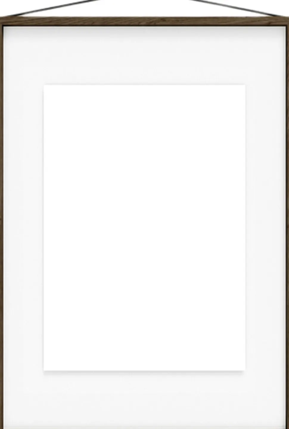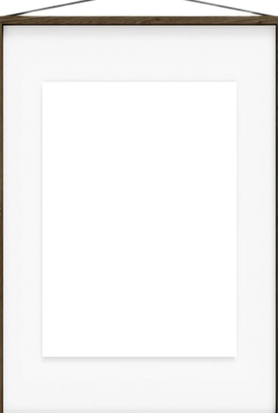 Rammen består af to stykker akrylglas, fire lister og et gummibånd. Gummibåndet holder begge rammen sammen og bruges til at hænge rammen på væggen. Den enkle, men smarte konstruktion gør det muligt at hænge rammen i begge retninger eller endda at blive set fra begge sider, hvilket giver dine kunstværker eller fotografier det fokus, de fortjener. Vælg mellem ti forskellige finishes og seks forskellige størrelser (40 x 50 cm og 50 x 70 cm fås kun i eg og sort)