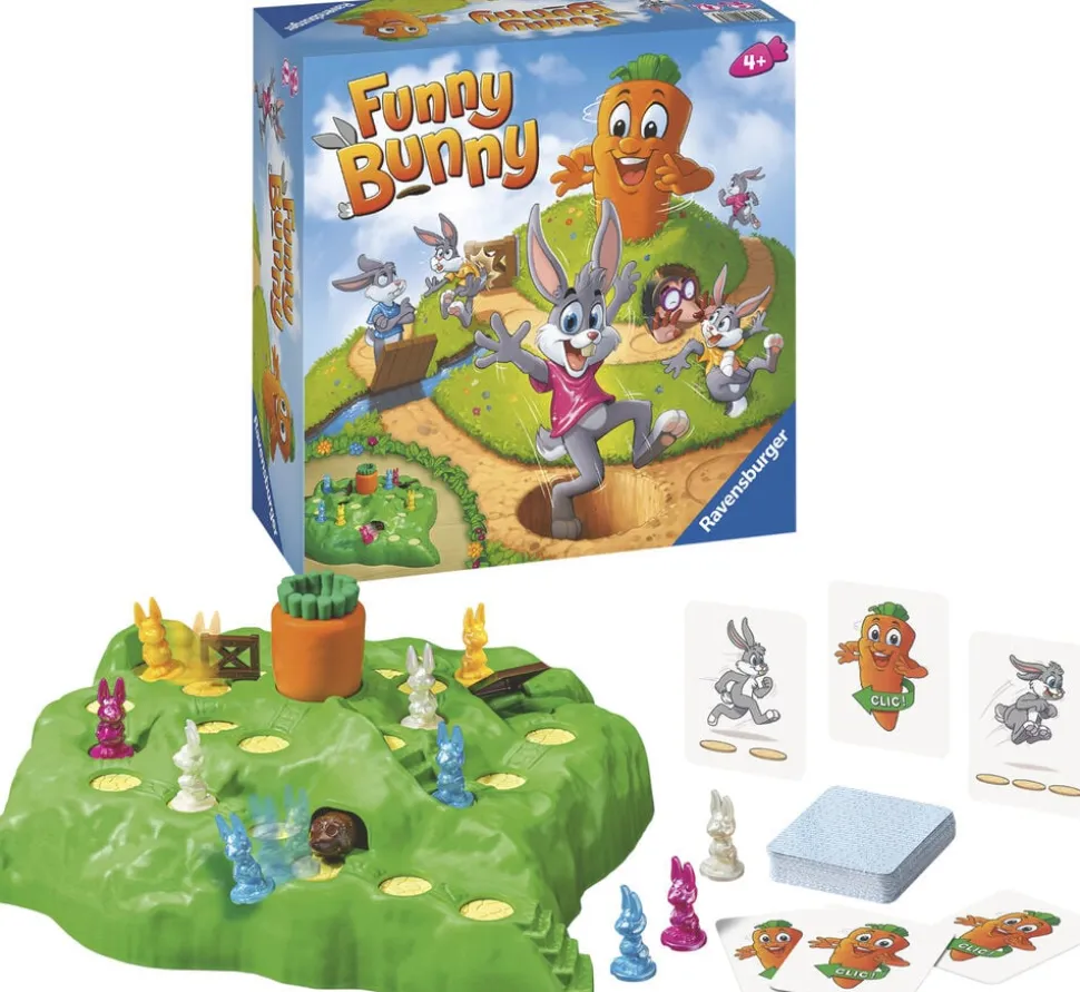 Vores små harer løber om kap for at nå den saftige gulerod på toppen af bakken Men vejen dertil er fuld af overraskelser Nogle gange åbner der sig pludselig huller. som – plump – haren forsvinder ned i, og andre gange skubber en fræk muldvarp kækt haren ned ad bakken Desuden gør en klapbro og en gitterlåge vejen til målet vanskelig for harerne Indhold 1 spillebakke med bevægelige huller, en muldvarp, en klapbro, en gitterlåge og en drejegulerod, 16 skinnende harefigurer. 48 spillekort, 1 vejledning Fra 4 år 2-4 spillere Spilletid ca 20 minutter