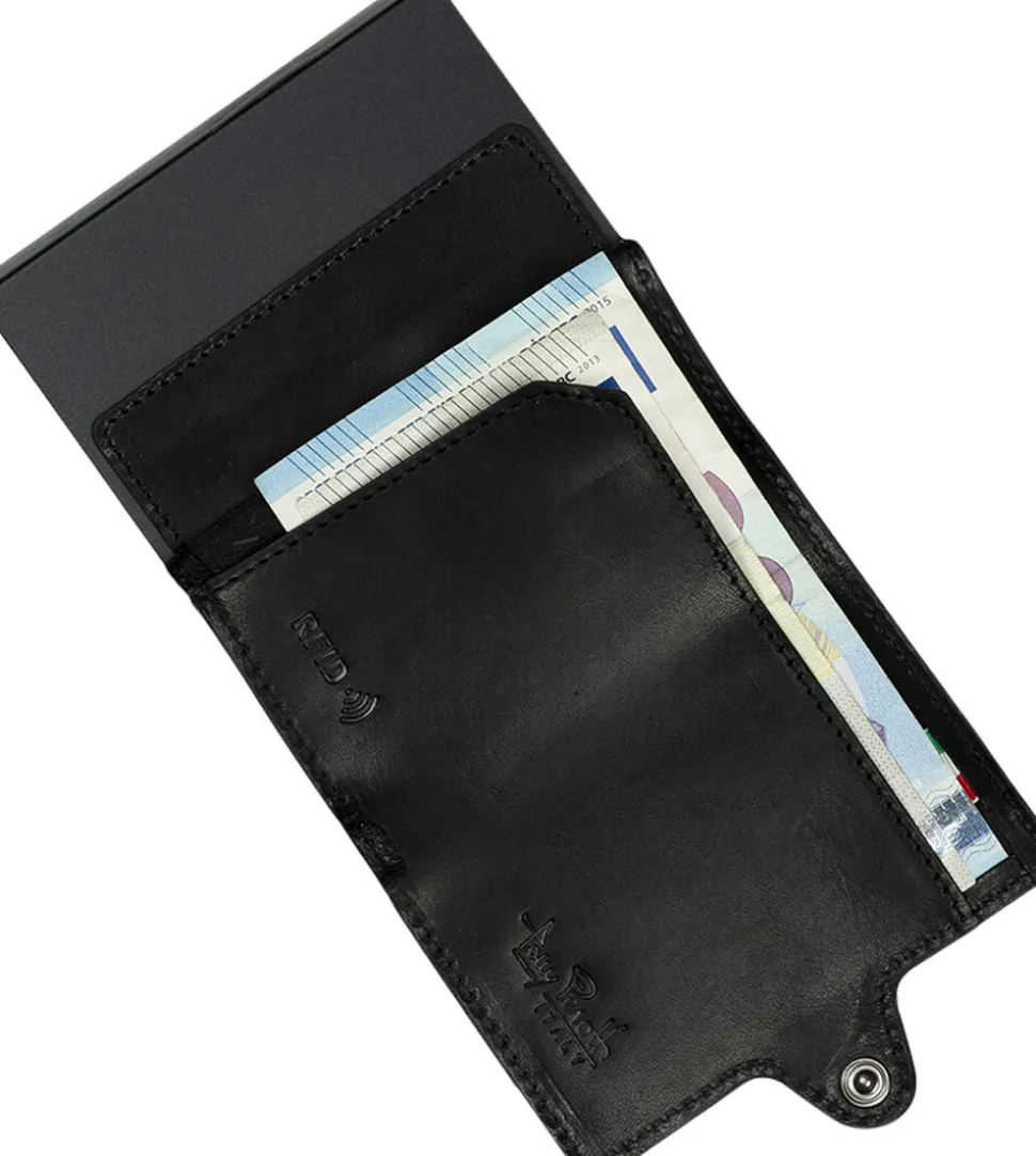 Furbo kortholderen er det perfekte alternativ til den traditionelle pung, designet til den moderne forbruger. Med sin kompakte størrelse passer den nemt i enhver bukselomme eller håndtaske. Denne kortholder er lavet af naturligt garvet italiensk koskindslæder og har en støbt aluminiumskortholder med et pop-up system, hvor der er plads til 4-6 kort.