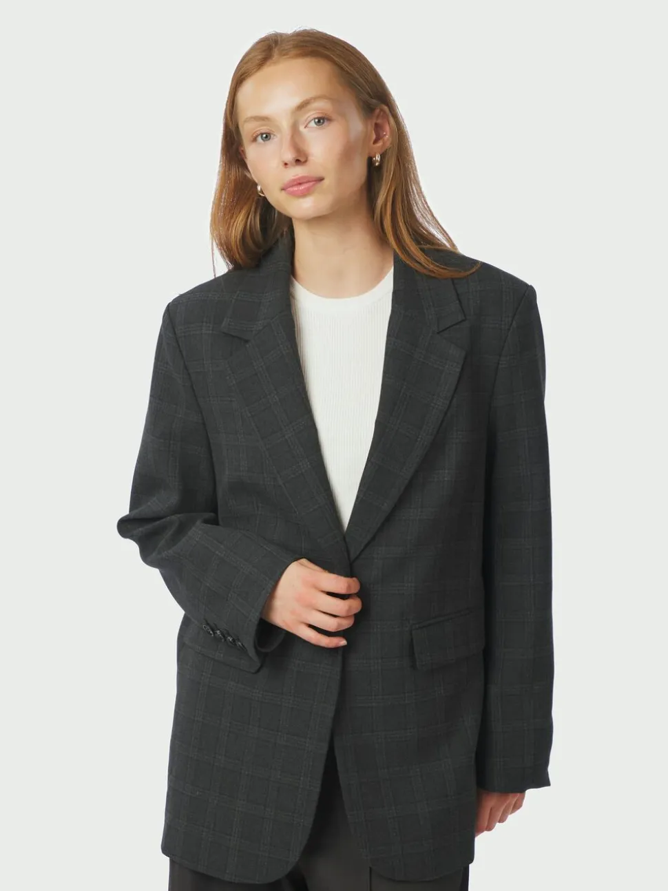 Cool blazer med skulderpuder og enkeltradet knapper i oversize pasform. Blazeren kommer i en lækker ternet kvalitet. Modellen er 176 cm og bærer en størrelse 36