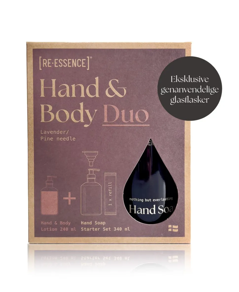 Denne gaveæske indeholder et lækkert og elegant sæt bestående af både håndsæbe og lotion med den beroligende signaturduft af lavendel /fyrrenål. Leveres i genanvendelige glasdispensere, der kan genopfyldes med [RE·ESSENCE] refills, der mindsker engangsplast og transport. Udviklet og produceret i Danmark