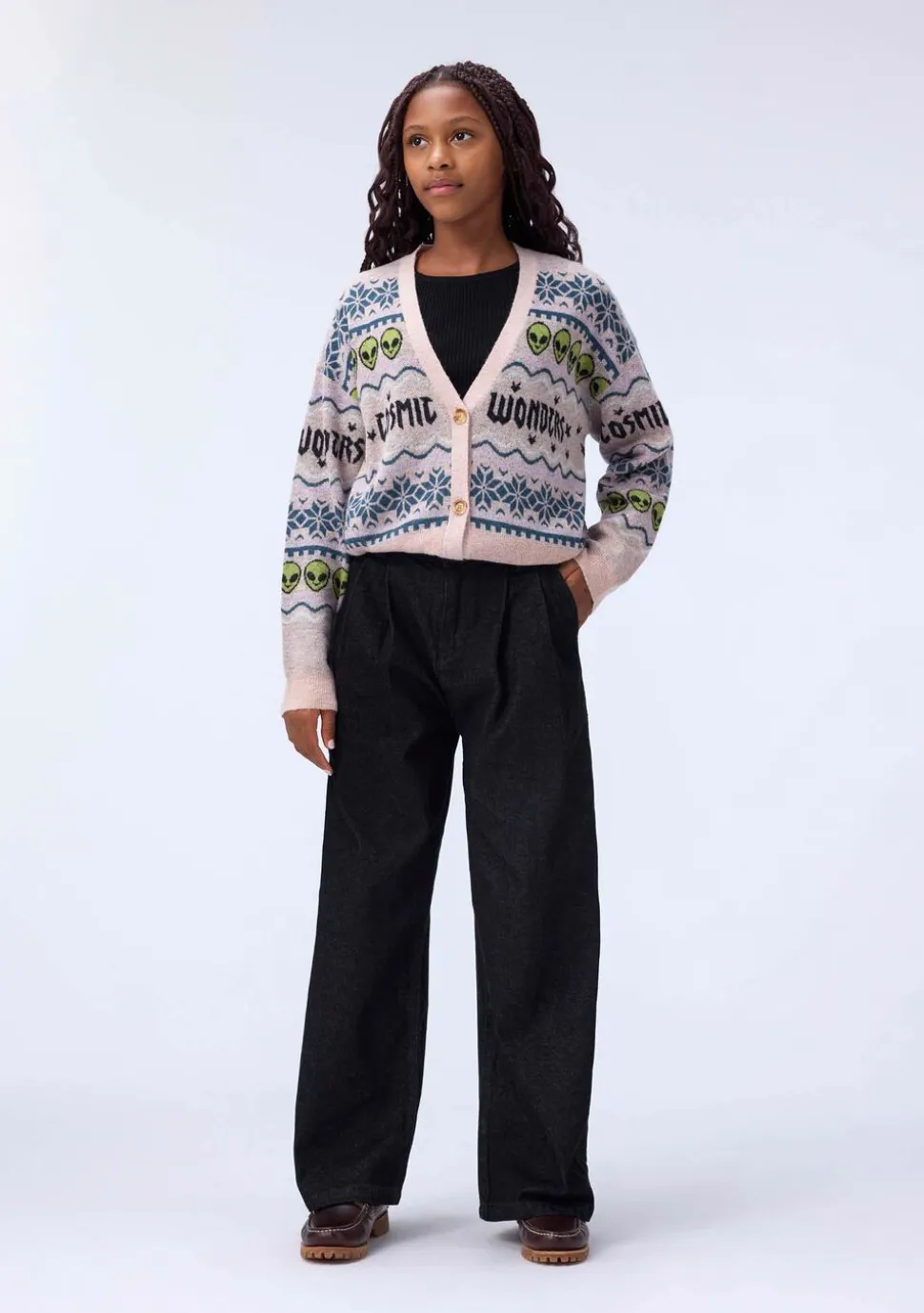 Denne flotte cardigan fra Molo er lavet i en blanding af uld og alpaka. Den har et farvestrålende mønster inspireret af nordisk strikkehistorie med små alien og teksten ‘Cosmic Wonder’. Cardiganen har V-udskæring, ribafslutning og fine knapper foran.