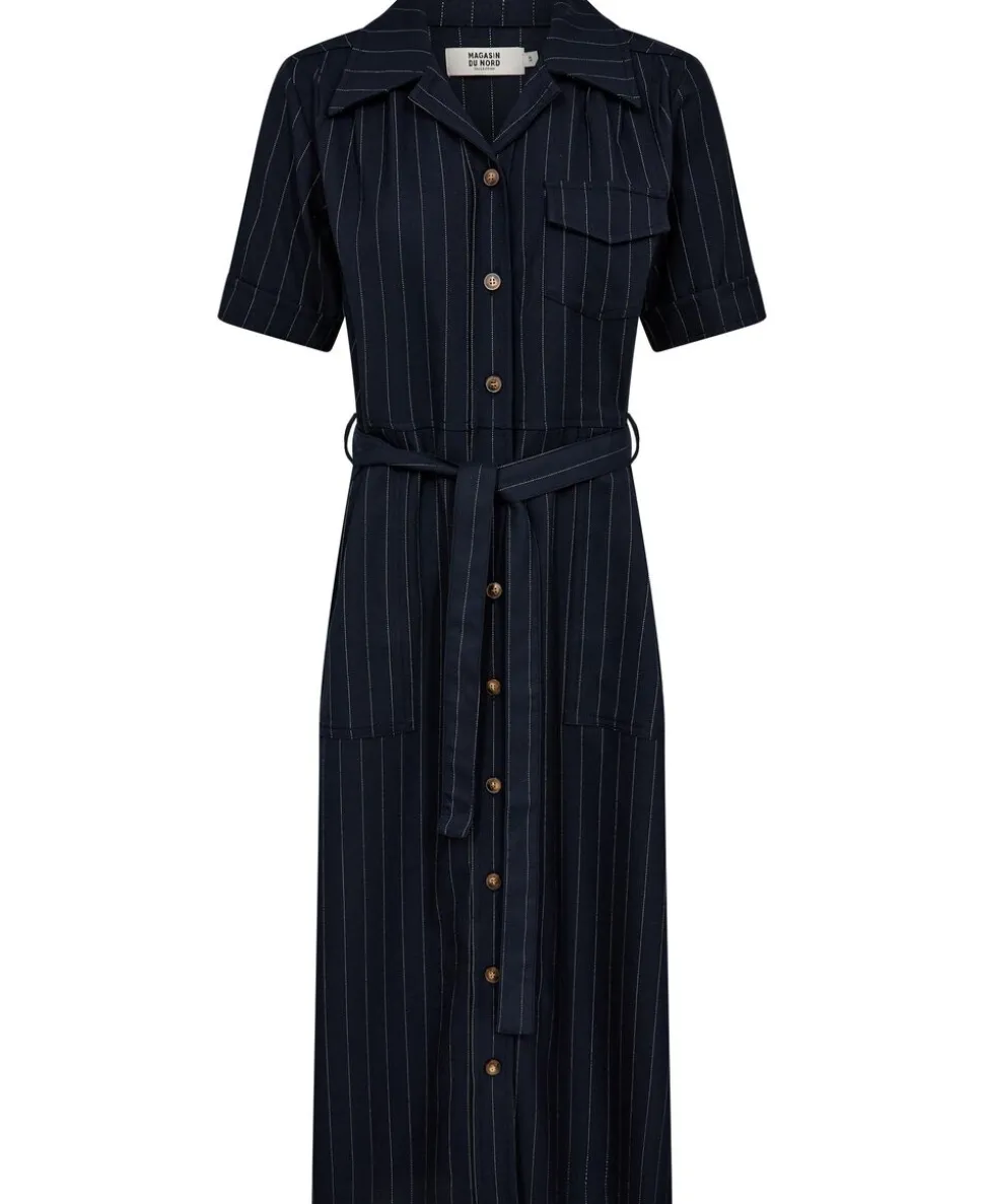 Skjortekjole fra Magasin du Nord Collection i den lækreste kvalitet af 63% genanvendte fibre med GRS-certificering. Kjolen har et fint, nålestribet print, hornknapper på fronten, korte ærmer, en åben krave, brystlomme, sidelommer samt et bindebånd i taljen. En skøn skjortekjole i en lækker kvalitet.