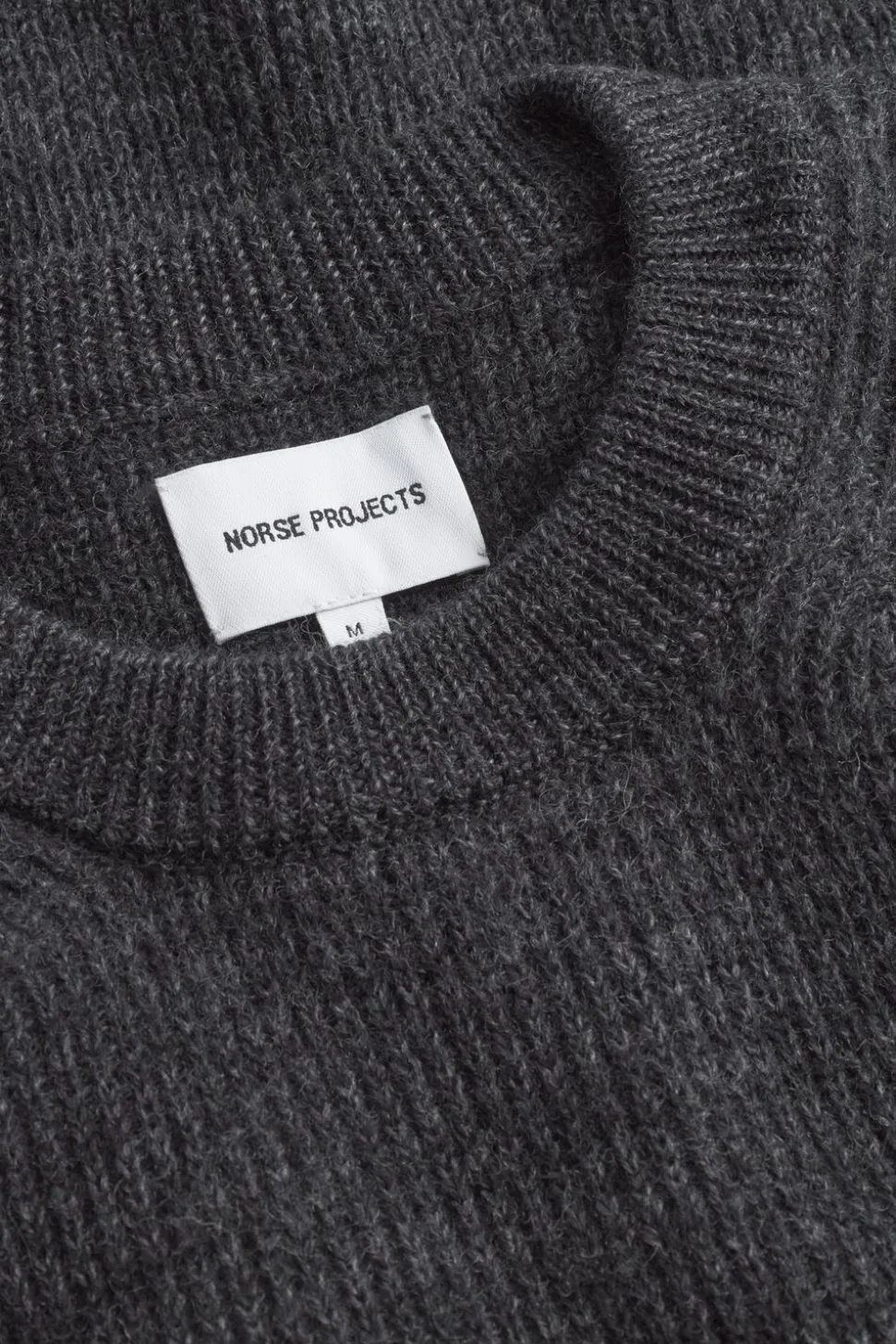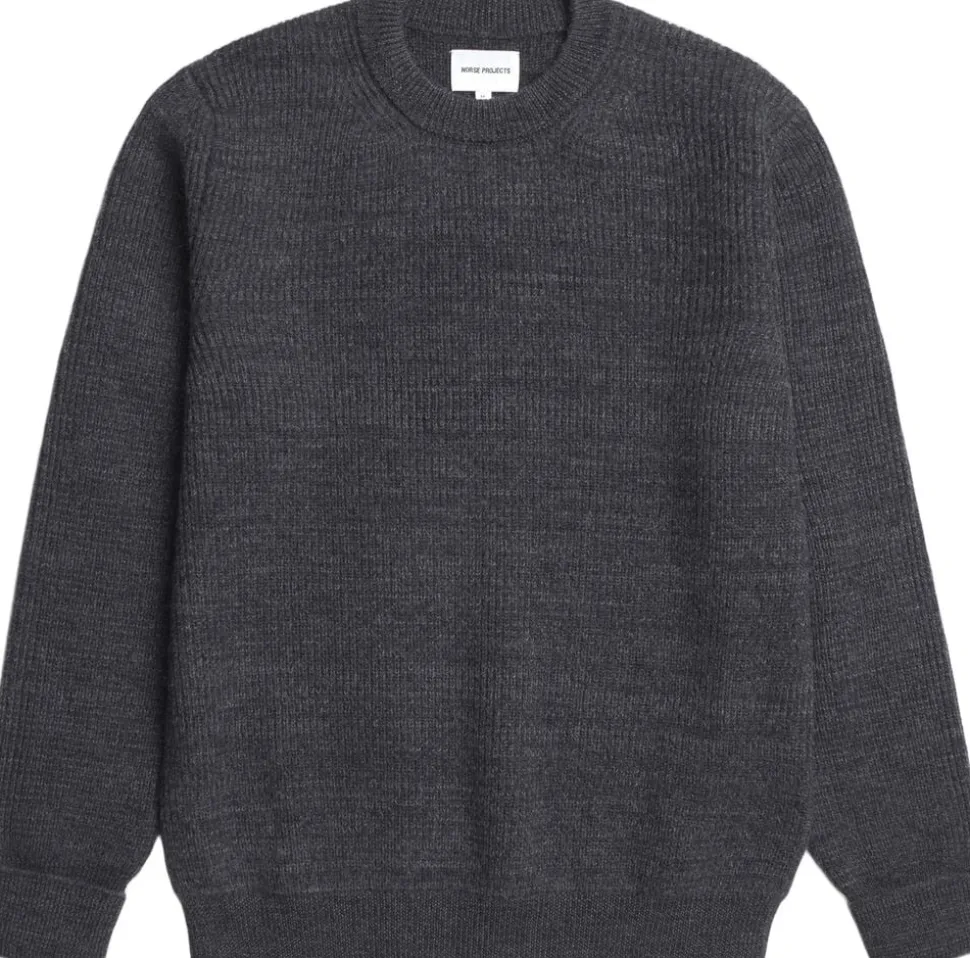 Rund hals med almindelig pasform i en vaskbar blanding af bomuld og uld. Har indsatte ærmer, ribstrikket hals, manchetter og kant samt en brandet fane ved sømmen.