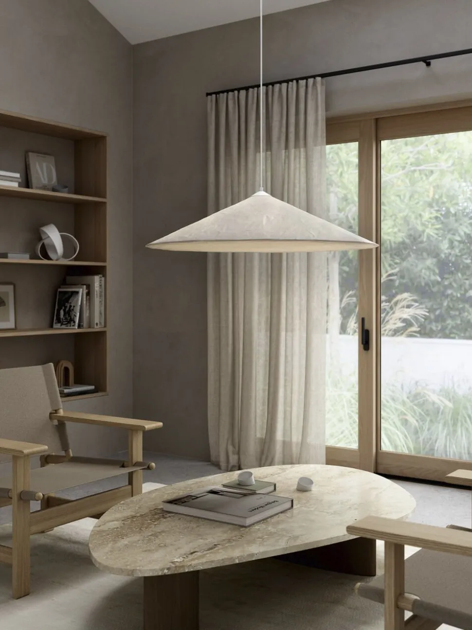 Hill er en stor, geometrisk lampeskærm, der skaber blikfang i rummet uden at blokere for udsynet. Hill er skabt af den danske designer Asger Risborg og er let som en sky, men har den samme skarpe silhuet som en klippe. En både kompleks og enkel lampe, der samtidig skaber et meget blødt lys, der spreder sig ud i rummet på en rolig og ensartet måde.