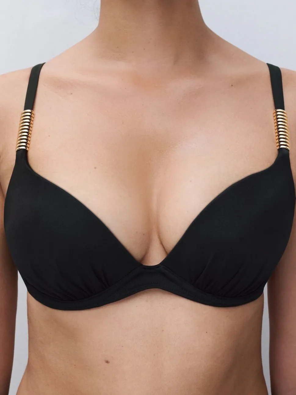 Bikinitop fra Icon-serien fra Chantelle, perfekt til den moderne kvinde, der gerne vil føle sig både stilfuld og godt tilpas ved vandet. Denne bikinitop er designet til at give dig den perfekte balance mellem funktion og mode, med nøje udvalgte detaljer, der virkelig gør en forskel. Bikinitoppen er pyntet med gyldne Zamac-tilbehør, der ikke bliver varme i solen. Disse detaljer tilføjer et elegant touch, der vil få dig til at skille dig ud på stranden eller ved poolen. Med en formende foring og lægeffekt foran får du en flatterende silhuet.