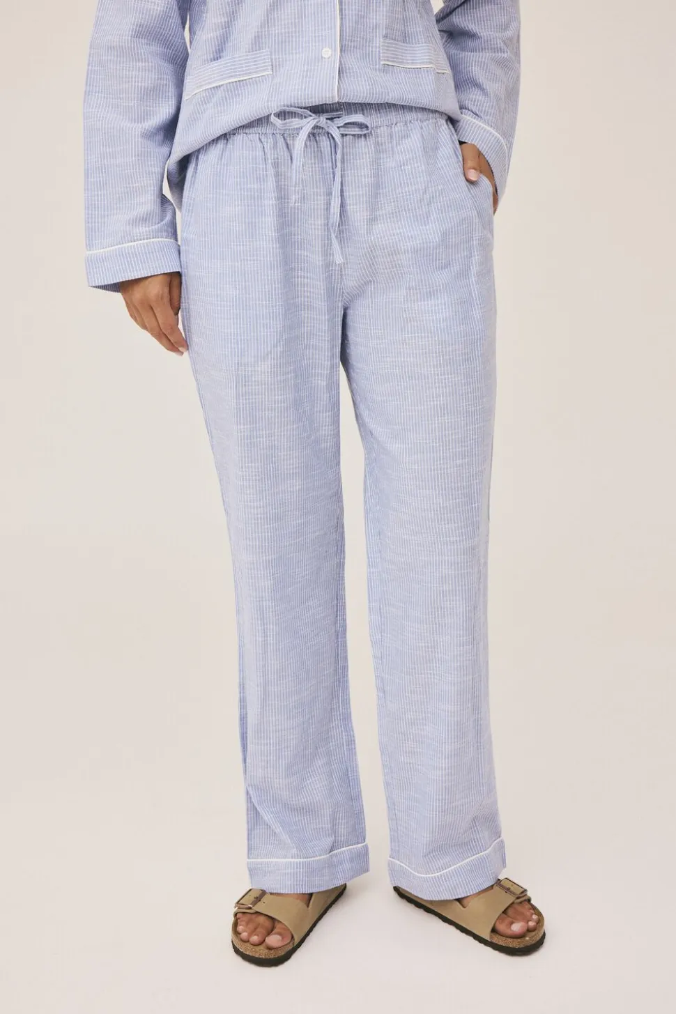 Bukser fra Magasin du Nord Collection i en blød og lækker 100% bomuldskvalitet med smalle striber. Bukserne har en løs pasform med elastik i taljen og bindebånd på fronten. Derudover har de praktiske lommer i siderne samt brede kanter forneden med pipingbånd. Kombiner dem fx med en overdel fra Magasin du Nord Collection for et komfortabelt og luksuriøst natsæt.