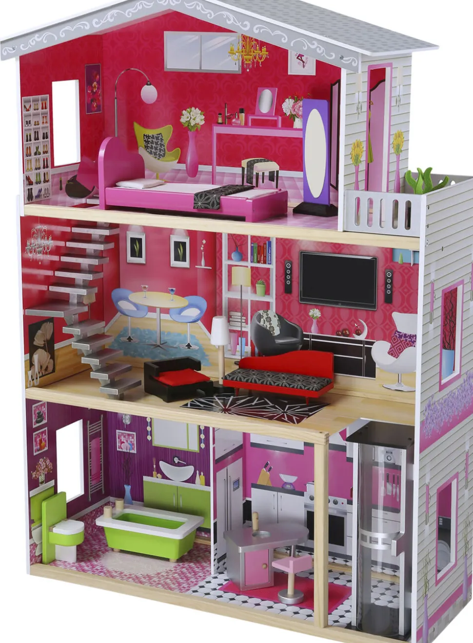 Kæmpe mannequindukkehus i træ Fuldt møbleret og solidt kvalitetsdukkehus i 3 etager Måler 115×82. 5×32 cm Uden dukke