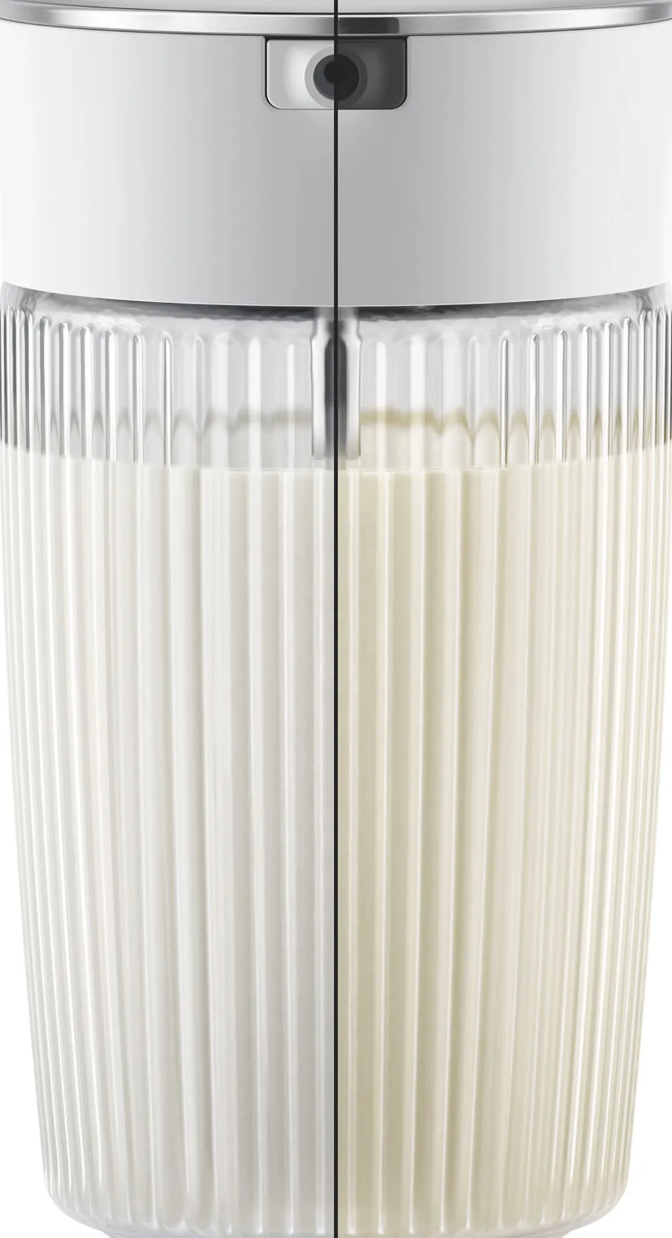 Takket være de medfølgende, udskiftelige silikoneadaptere i både sort og hvid, kan du hurtig se, hvad mælkekaraflen indeholder, mælk eller en plantebaseret drik.