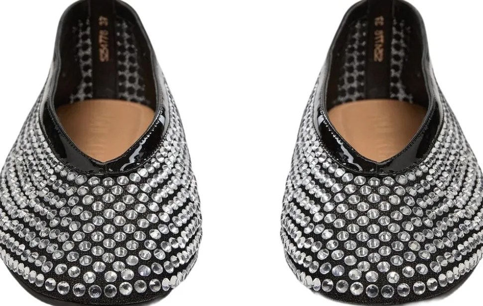 • Meshballerina • Beklædt med rhinsten • Rund tå • Sort patent-look • Flad sål • 85% mesh, 15% læder