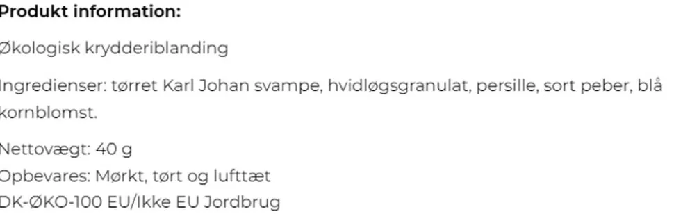 Til smagssætning af risotto, saucer eller perlekorn. Brug ca. 2 spsk krydderi per 100 g risotto ris. 1 spsk (ca. 10 g) svarer til ca. 100 gram frisk Karl Johan svamp. Karl Johan svampen er en af vores yndlingssvampe, for den giver en skøn smag af jordbund, efterår og umami til vores madlavning. Vi bruger et tørret granulat af Karl Johan svampen som basis for vores 2 nye produkter. De giver en koncentreret og raffineret smag til din madlavning. Økologisk krydderiblanding Ingredienser: tørret Karl Johan svampe, hvidløgsgranulat, persille, sort peber, blå kornblomst. Nettovægt: 40 g. Opbevares: Mørkt, tørt og lufttæt. DK-ØKO-100 EU/Ikke EU Jordbrug
