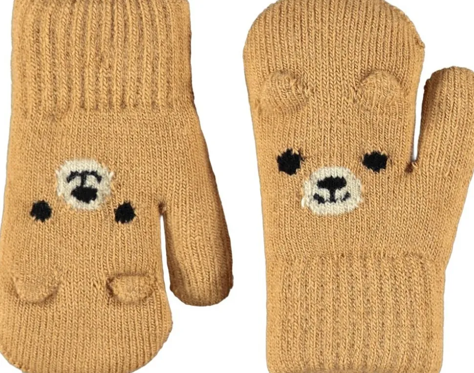 Brune strikvanter fra Molo med bamseansigt. Vanterne har en ribkant ved håndleddet og et blødt fleecefor, der holder hænderne varme.