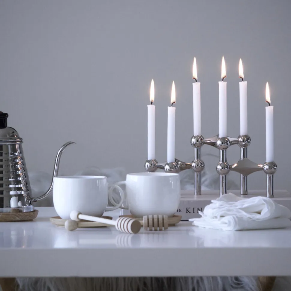 Kertelysene matcher STOFF Nagel stagerne på smukkeste vis. Lysene er produceret af paraffinvoks, et rent mineralsk produkt, renset for urene partikler. Paraffinvoks er desuden den type voks med det laveste C02 aftryk og mindste miljøbelasting. Lysene er gennemfarvede for at opnå et eksklusivt og rustikt udseende. Bomuldsvægerne er desuden lavet af 100% bomuld, hvilket påvirker indeklimaet mindre end traditionelle væger, idét færre partikler frigives.