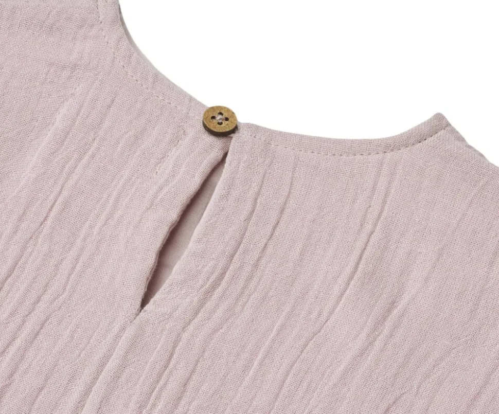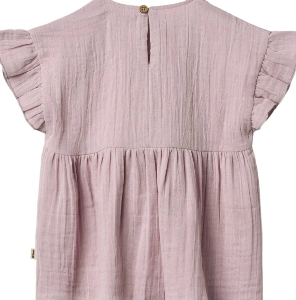Kortærmet kjole med flæsedetaljer i økologisk bomuld til baby. – Lav skuldersøm – Flæser ved ærmegab – Skæring over taljen – Knaplukning bagpå – Længde: Over knæene – Krøllet gauze materiale Wheat’s yndige sommerkjoler har detaljer, prints- og farver, der emmer af sommer. Denne kjole har en løs pasform i skørtet, der gør det nemt for dit barn at bevæge sig rundt i den. Kjolen har et flatterende snit med bærestykke over taljen. Dette får skørtet til at synes voluminøst med læg og vidde. — – Standard 100 af OEKO-TEX® – 100% Økologisk bomuld – Produktet er GOTS-certificeret
