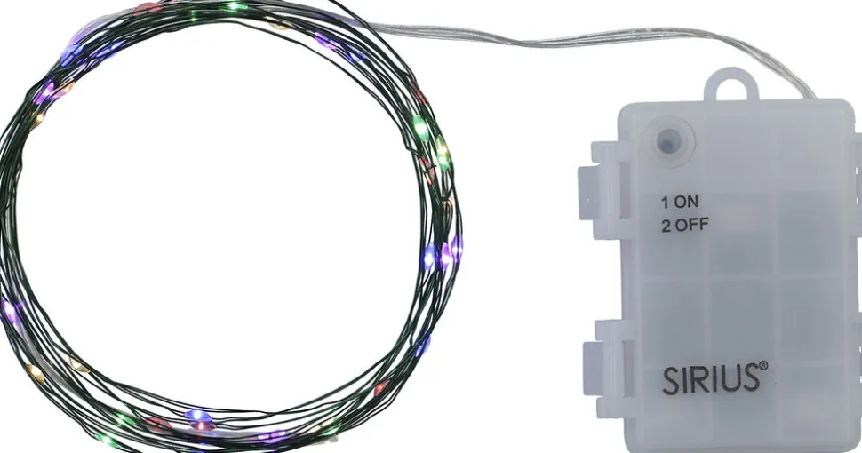 Sirius Batteri-Lyskæden Knirke har 40 meget små fine (0,5 cm) LED lys. Kæden er lavet med en fin tynd grøn ledning og pærerne er et mix af forskellige farver. Meget dekorativ kæde. Kæden har en udendørs batteriboks, og er velegnet til at skabe en fin stemning ude i haven. Kæden er 3,9 meter lang, og har et varmt naturligt lys. Dekorationen er batteridrevet og har en indbygget timer-funktion, der slukker lyset automatisk efter 6 timer, hvis du ikke selv slukker dem. Efter 18 timer tænder lyset igen, og sådan vil det fortsætte, hvis du ikke bruger sluk knappen. Batterier medfølger ikke. Der skal isættes 3 AA Batterier. Kan benyttes både indendørs og udendørs.