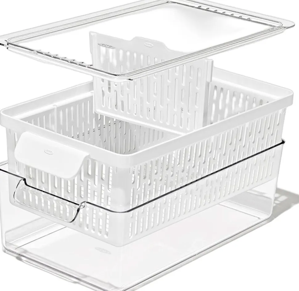 OXO Køleskabsopbevaring er opbevaringsbeholdere designet til at hjælpe med at holde dine produkter i køleskabet friske i længere tid. Mellem beholderen har den perfekte størrelse til bladgrøntsager, peberfrugter, vindruer og anden frugt og grønt. Den justerbare skillevæg holder produkter organiseret og synlige, hvilket hjælper med at reducere madspild slut med at finde en glemt rådden grøntsag bagerst i køleskabet. Den indvendige kurv holder produkterne eleveret og fremmer optimal luftcirkulation, så dine grøntsager holdes friske. Den indvendige kurv er udtagelig, så du kan bruge den til at skylle grøntsagerne. Beholderens komfortable håndtag gør det nemt at tage beholderen til køkkenbordet, og låget, der kan åbnes fra alle sider, giver adgang, uanset om du åbner det i køleskabet eller på køkkenbordet. Låget kan endvidere sættes på højkant på kurvens kant. Mellem beholderen måler 35,1 cm x 18,9 cm x 11,8 cm. Beholderen er BPA-fri, tåler opvaskemaskine og kan stables med andre OXO Køleskabsopbevaringsbeholdere.