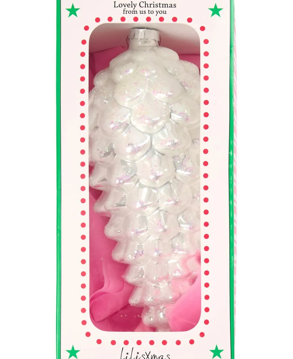 Kogle fra LiLisXmas i glas med det fineste glimmer. Koglen har en tynd tråd, så den kan hænges på juletræet eller pynte i hjemmet. Smuk julepynt, der fås i flere fine farver og størrelser.