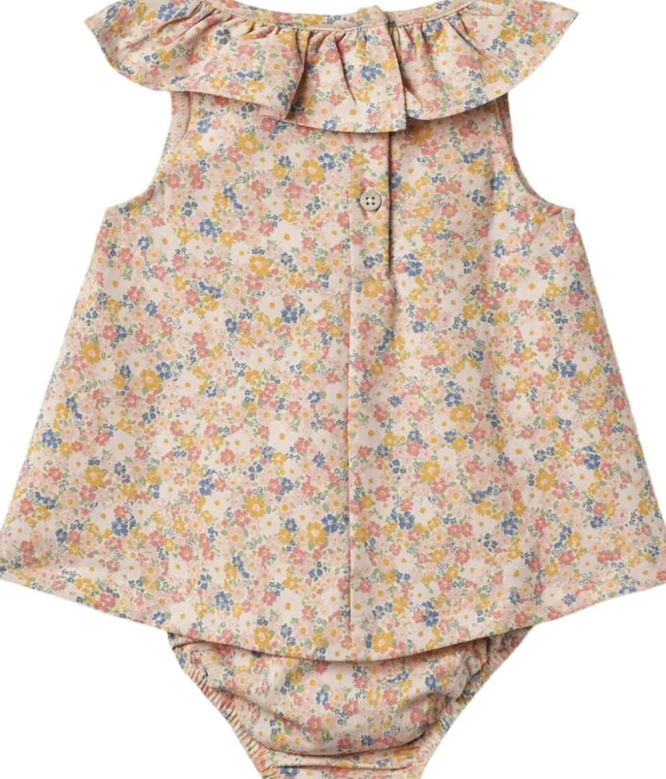 Yndig ærmeløs bodykjole i økologisk bomuld til din baby. – Fin krave med læg og rynk – Knaplukning bagpå – Bærestykke udover, som ligner en kjole – Trykknapper i bunden for bedre komfort – Wheat signaturprint Wheats yndige bodykjoler har detaljer, prints- og farver, der emmer af sommer. Den har et flatterende snit, der ligner en kjole udover bodyen. Dragten har knaplukning bagpå og bodyen har trykknapper i bunden, som gør det nemmere for dig at iklæde dit barn. Stylen er nem at style efter lejlighed med et par små sandaler, futter eller prewalkers afhængigt af vind og vejr. Man kan kombinere bodykjolen et par strømpebukser, en basis body indenunder og en cardigan udover som let jakke på de lune eftermiddage. — – Standard 100 ved OEKO-TEX® – 95% økologisk bomuld, 5% elastan – Produktet er GOTS-certificeret