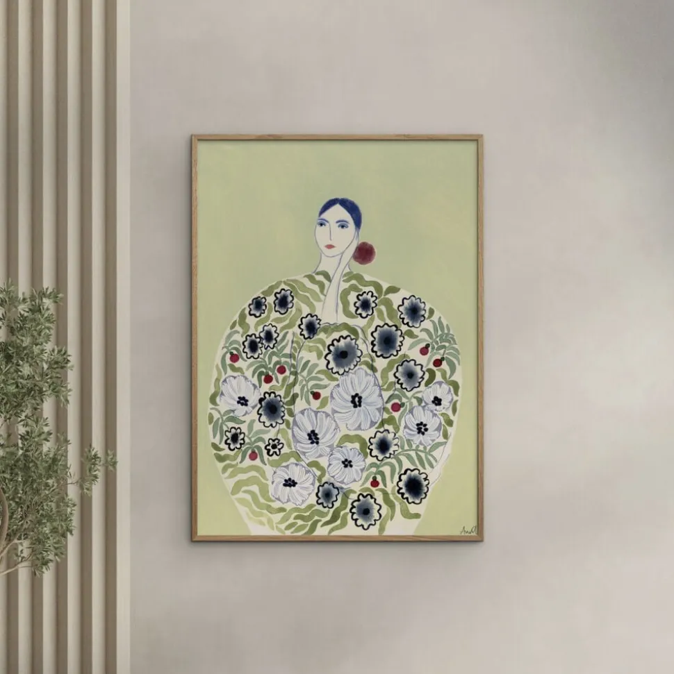Unik og feminin kunstplakat med en elegant figur omgivet af smukke blomster. Tilføj et strejf af farve og sofistikation til dit hjem