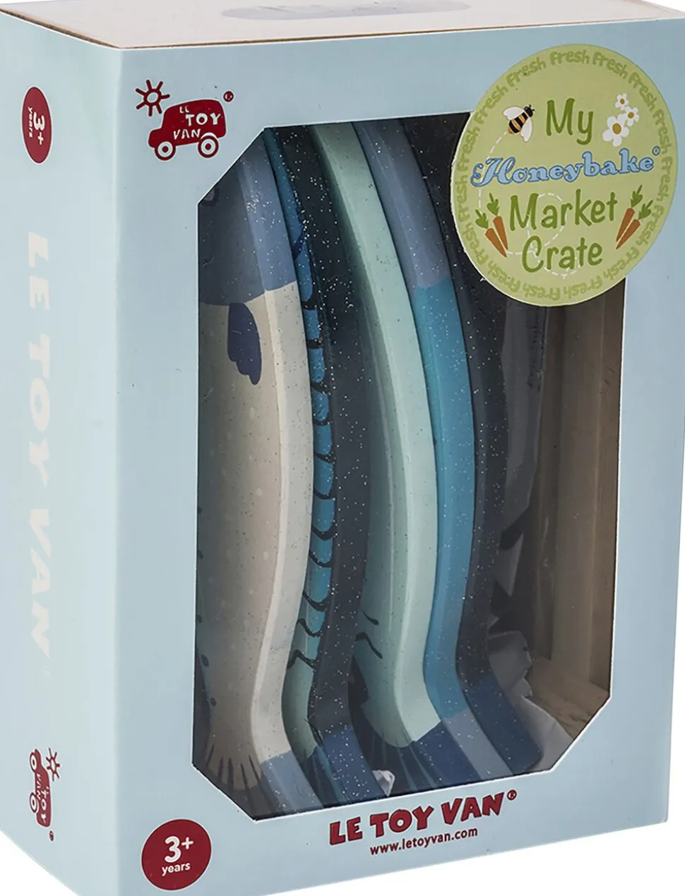 Friske fisk: Friske fisk. 6 stk. glitrende og flot malede træfisk der altid er helt friske. Det hele leveres i en fin trækasse der passer til markedsboden fra Le toy van.