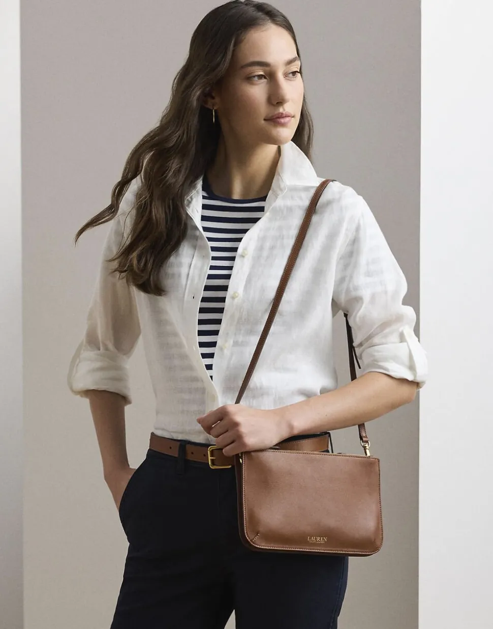 Den mellemstore Landyn-taske er kendetegnet ved sin konvertible karakter og er designet med to aftagelige og justerbare stropper – en overkropsstrop i læder og en “Lauren Ralph Lauren”-flettet rem – for flere Styling-muligheder. Den er perfekt til opbevaring af dine vigtigste ting og er fremstillet af smidigt fuldkornslæder, som er kendetegnet ved sin naturligt glatte finish