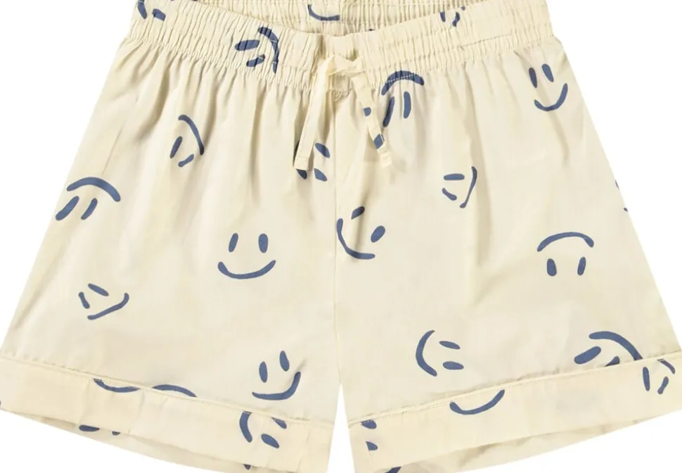 Råhvidt pyjamas-sæt med korte ærmer og ben i økologisk bomuld. Skjorten har en løs pasform, en krave med knapper ned langs fronten, en brystlomme og ombuk ved ærmerne. Shortsene har også en løs pasform, går til midt på låret og har elastik samt snøre i taljen. Sættet prydes af et allover print af smilende mørkeblå ansigter.
