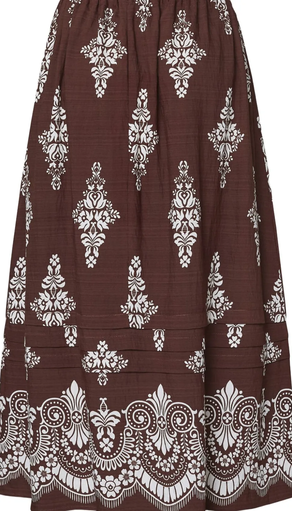 er en lang nederdel med elastik i taljen og et bindebånd. Nederdelen har et gennemgående mønster og en bred, dekorativ kant forneden. Modellen har en str. S på og er 171 cm høj.