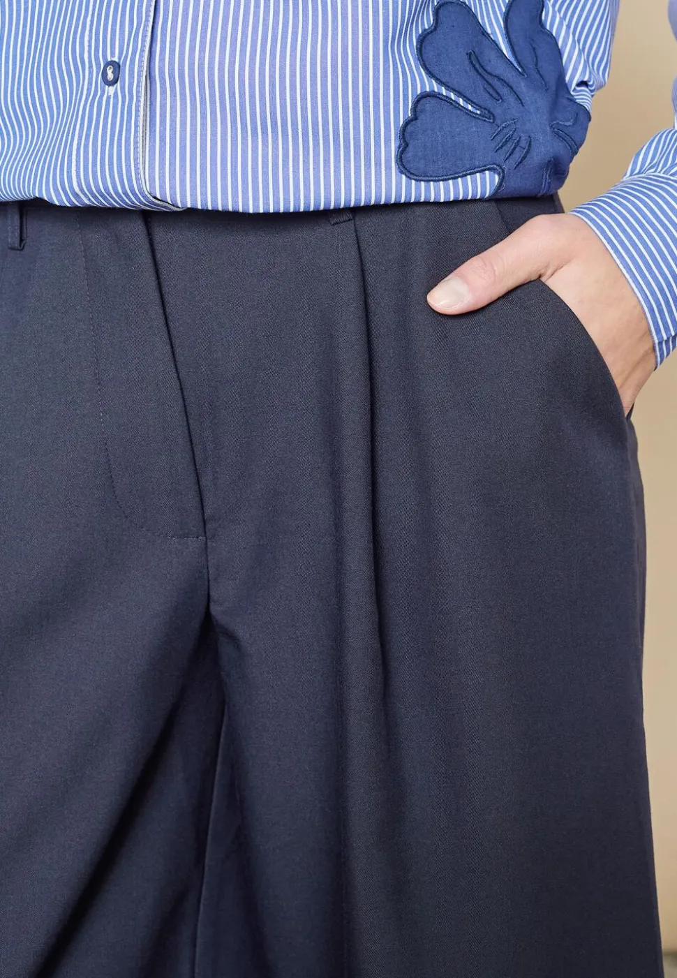 er et par bermuda shorts med en løs pasform og bredde i benene, som ender omkring knæene. Shortsne har en høj talje med bæltestropper. Modellen har en str. S på og er 179 cm høj.