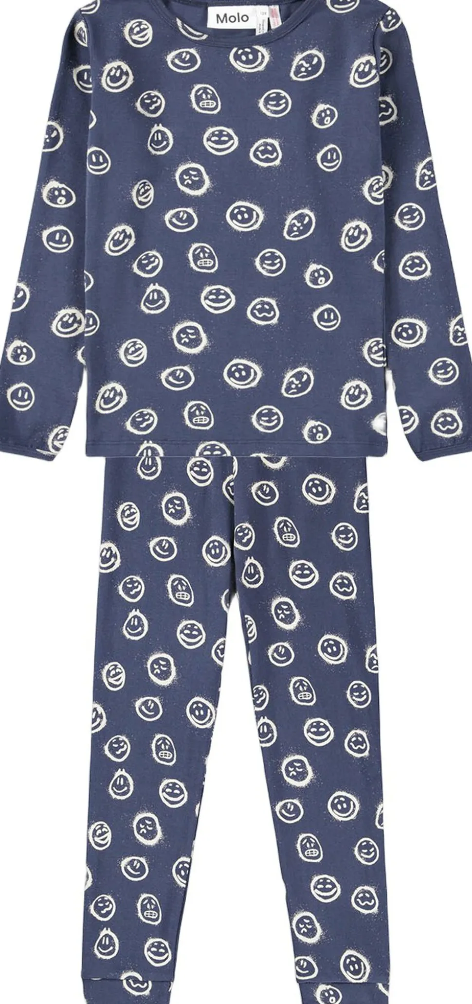 Dette nattøjssæt fra Molo er fremstillet i økologisk bomuld. Bukserne har en elastisk talje og ribkant ved anklerne, mens toppen har en rund halsudskæring og et stort, spraymalet smil i sort som placeret print på fronten.