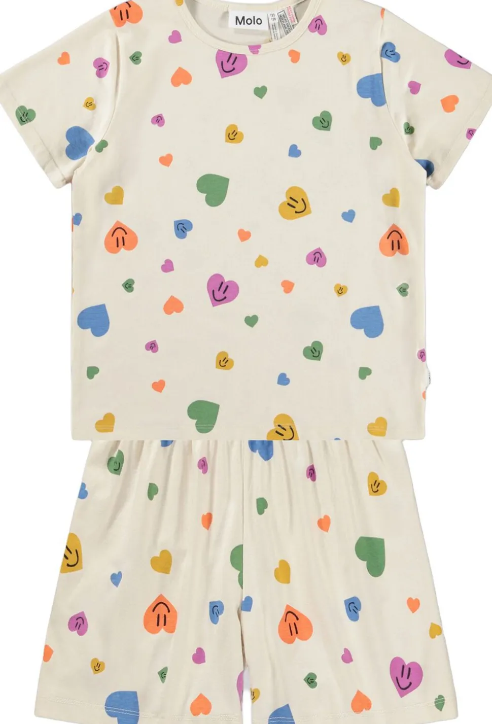 Lækkert nattøj med korte ærmer og ben, fremstillet i blødt, strækbart bomuld. Dette todelte sæt inkluderer en løs t-shirt med rund hals og shorts med elastik i taljen for optimal komfort. Det festlige print af smilende hjerter gør det til et sjovt valg til sengen, som både børn og forældre vil elske. Perfekt til afslappede nætter og hyggelige stunder.