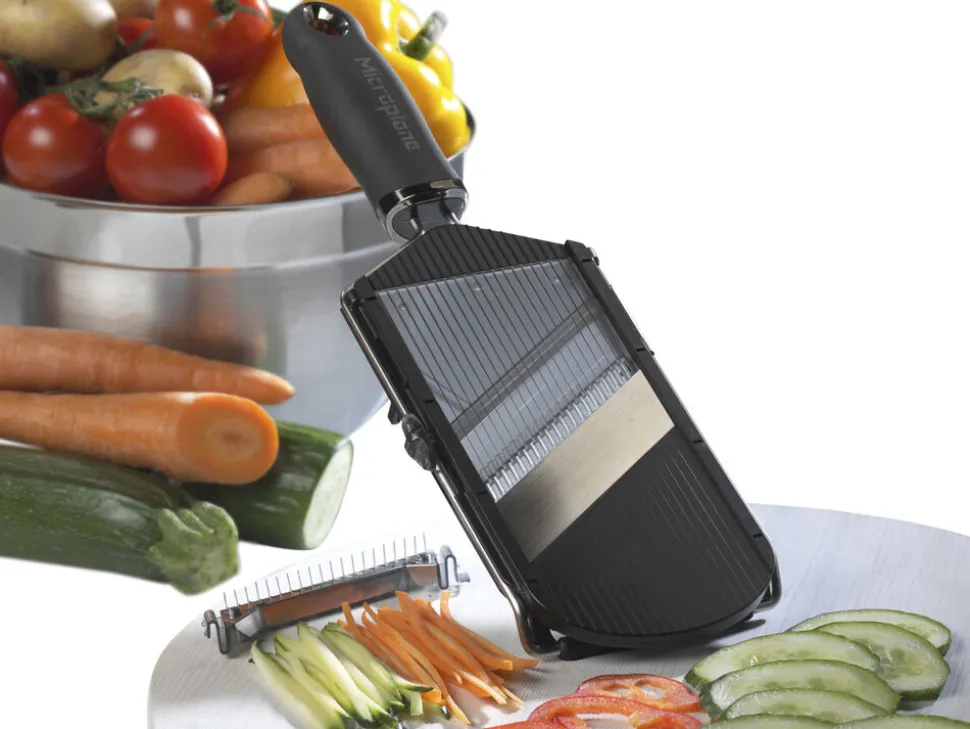 Ultraskarpt lille og handy mandolinjern med både skive-funktion til at skære grøntsager i tre tykkelser, samt julienneskær til fine ensartede juliennestrimler. Microplane mandolinen er både kvalitetsmæssig og prismæssig et rigtig godt alternativ til de meget store og dyre mandoliner. Prisen er inkl. slæde.