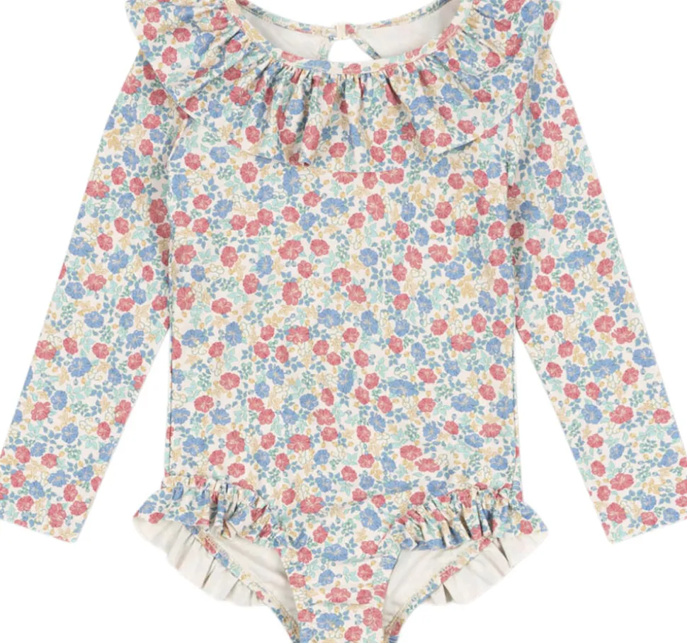 Langærmet badedragt designet med flæsedetaljer. Beskytter mod solens UV-stråler med den højeste ultraviolette beskyttelsesfaktor, UPF 50+. Trykknapper ved benåbning fra størrelse 6M -18M. Materialer – 80 % Recycled polyester, 20 % elastan. Dette produkt indeholder 80 % GRS-certificeret polyester, certificeret af CU 1094701. Dette produkt er OEKO-TEX® STANDARD 100, klasse 1 certificeret af DTI Tekstil, DTI 2276-361.