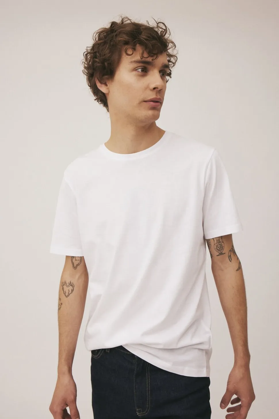 T-shirt fra Magasin du Nord Collection i den blødeste kvalitet af 100% økologisk bomuld med GOTS-certificering. T-shirten er enkel i modellen med korte ærmer, en smal ribkant langs den runde halsudskæring samt en løs pasform. En klassisk T-shirt i den lækreste kvalitet. Global Organic Textile Standard (GOTS) certificeringen sikrer en sporbar forsyningskæde af økologisk materiale, der overholder strenge miljø- og kemikrav samt ordentlige arbejdsforhold i alle led. Økologisk materiale kommer fra landbrug, hvor man arbejder med naturen på en måde så både økosystemer og biodiversitet opretholdes. Det betyder, at der ikke benyttes giftige kemikalier, at vandforbruget begrænses og at der i højere grad anvendes regnvand i produktionen.