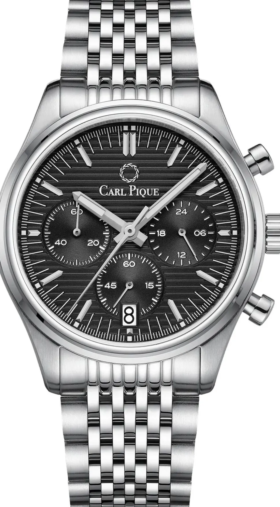Carl Pique Maurice CP0060 uret kombinerer klassisk design med praktisk funktionalitet. Det har en rund urkasse og en detaljeret urskive med tre kronografer og en datovisning, der tilføjer dybde til udseendet. Den sorte urskive står i imponerende kontrast til den sølvfarvede urkasse og bezel. Uret er udstyret med kvarts urværk drevet af TMI VD54 kaliber.
