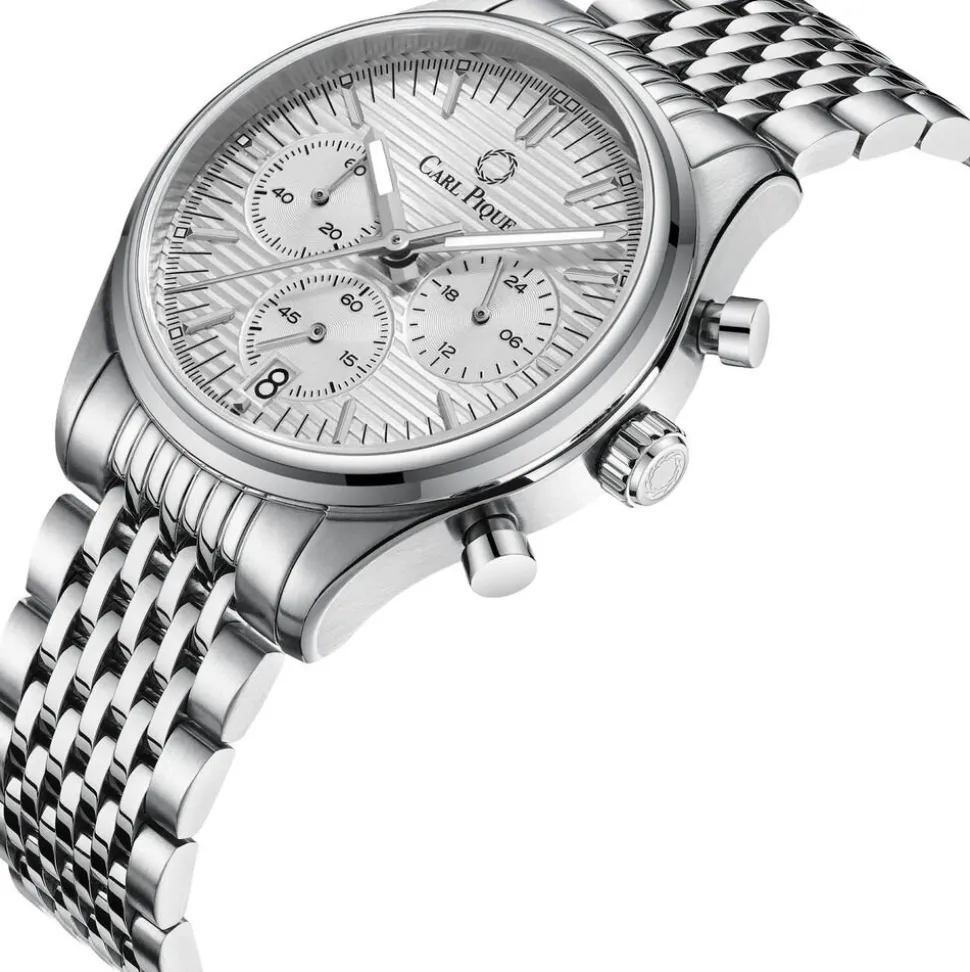 Carl Pique Maurice CP0062 er et stilfuldt ur, der kombinerer funktionalitet med et strømlinet design. Uret har en rund urkasse med en detaljeret urskive, der inkluderer flere kronografer for ekstra funktionalitet. Urskiven er udsmykket med et mønster, der skaber en dynamisk baggrund for viserne og markeringerne. Bezelen er glat og komplementerer det samlede strømlinede udseende. Den interlåsende stål-lænke tilføjer tekstur og elegance og ligger behageligt om håndleddet.