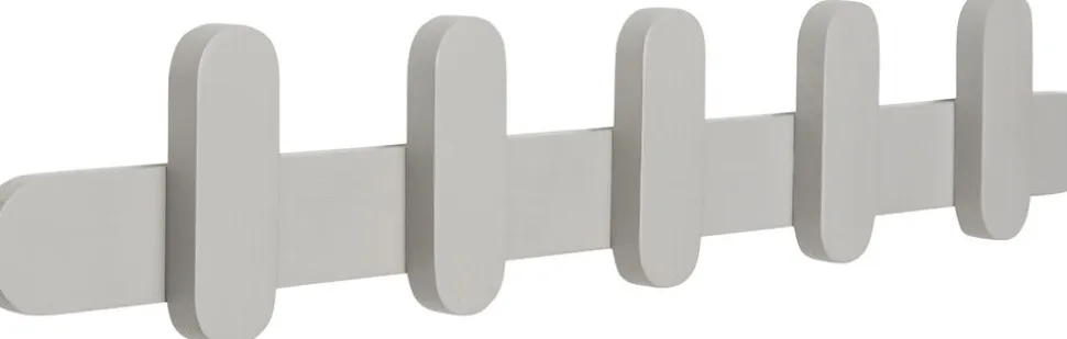 Lysegrå vægmonteret knagerække med fem knager i træ.