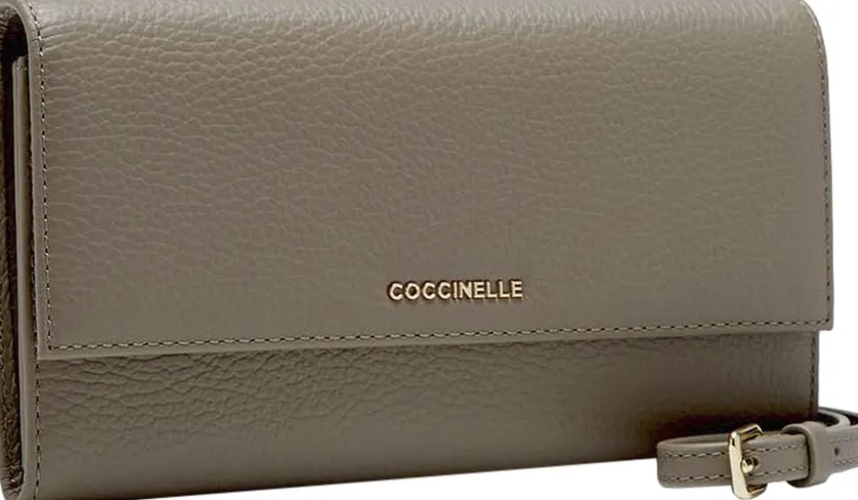 Smart minibag-wallet fra Coccinelle. Tasken/pungen lukkes med trykknap. Indvendigt er der 2 rum. I det ene rum er der f.eks. plads til en mobiltelefon. I det andet rum er der 8 rum til kort. Desuden lynlåsrum med plads til f.eks. mønter, nøgler el.l. Aftagelig, justerbar skulderrem i skind