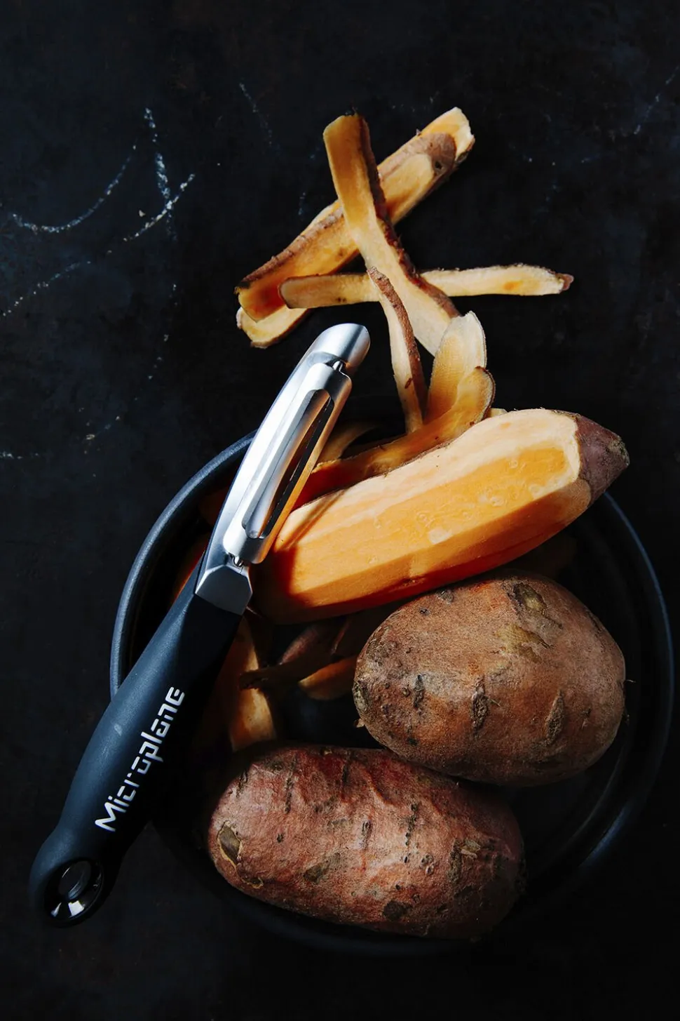 Proffesionel skræller fra Microplane. Ligger ergonomist godt i hånden. Kan skrælle begge veje samt bruges af både højre og venstre hånd.